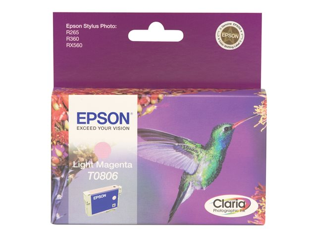 Produktbeskrivning Epson T0806 - ljus magenta - original - bläckpatron Typ av produkt Bläckpatron Utskriftsteknik Bläckstråle Utskriftsfärg Ljus magenta Egenskaper för tonerkassett Epson Claria Ink Kompatibel med Stylus Photo P50, PX650, PX660, PX700W, PX710W, PX720WD, PX730WD, PX800FW, PX810FW, PX820FWD, PX830FWD, R265, R285, R360, RX560, RX585, RX685 - Nedladdningsbara filer