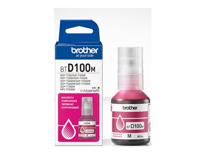 Produktbeskrivning Brother BTD100M - hög kapacitet - magenta - original - påfyllnadsbläck Typ av produkt Påfyllnadsbläck Utskriftsteknik Bläckstråle Utskriftsfärg Magenta Kapacitet 48.8 ml Kassettens kapacitet Hög kapacitet Avkastning Upp till 5000 sidor Förpackningstyp Hängande låda Kompatibel med Brother DCP-T530DW, DCP-T730DW, MFC-T930DW - Nedladdningsbara filer