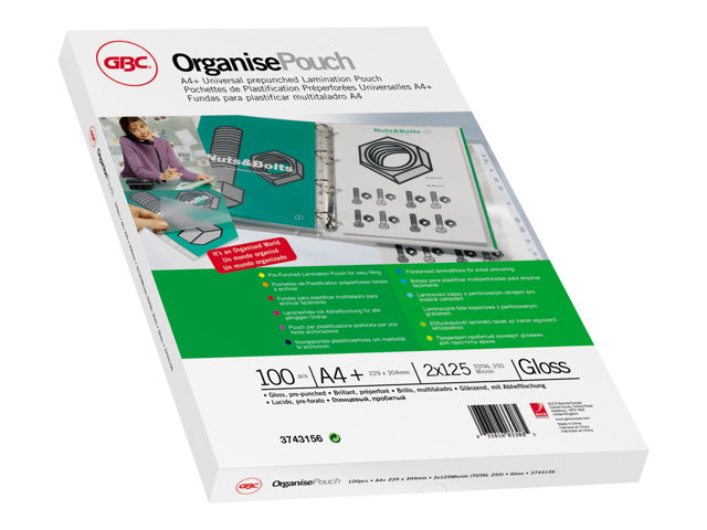 Produktbeskrivning GBC OrganisePouch - 100 - 229 x 303 mm - lamineringsfickor Typ av produkt Lamineringsfickor Medföljande antal 100 Mediastorlek 229 x 303 mm Mediefärger Glättat - Nedladdningsbara filer