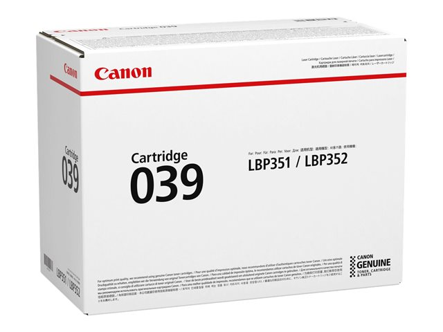 Produktbeskrivning Canon 039 - svart - original - tonerkassett Typ av produkt Tonerkassett Utskriftsteknik Laser Utskriftsfärg Svart Avkastning Upp till 11000 sidor Kompatibel med imageCLASS LBP351dn, LBP351x, LBP352dn, LBP352x; i-SENSYS LBP351x, LBP352x; Satera LBP351i - Nedladdningsbara filer