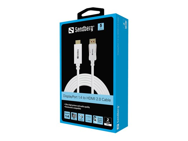Produktbeskrivning Sandberg - videoadapterkabel - DisplayPort till HDMI - 2 m Typ Videoadapterkabel Egenskaper Stöd för 4K, maximal upplösning 3840x2160 vid 60Hz Kabellängd 2 m Kontaktdon 20-stifts DisplayPort - hane Kontakt (andra änden) 19-stifts HDMI typ A - hane Standarder som följs DisplayPort 1.4 Färg Vit Tillverkarens garanti 5 års garanti - Nedladdningsbara filer