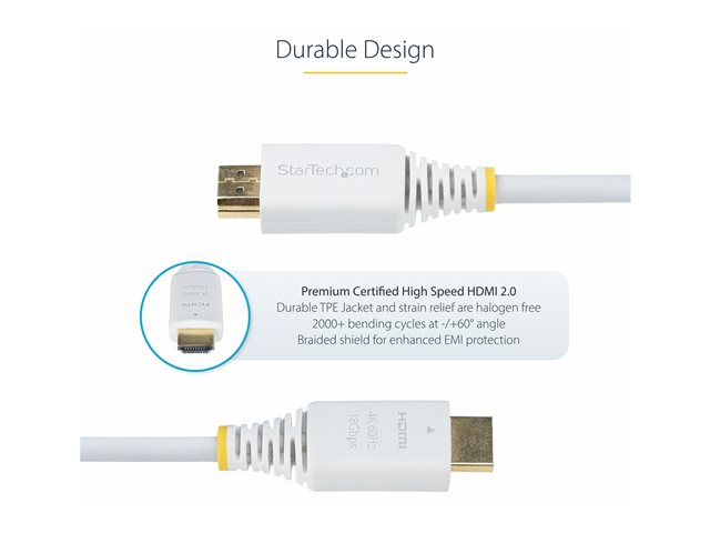 Produktbeskrivning StarTech.com 10ft (3m) Premium Certified High Speed HDMI Cable, 4K60Hz - HDMI-kabel med Ethernet - 3 m Kabel Premium hög hastighet - HDMI-kabel med Ethernet Teknik Skärmad American Wire Gauge (AWG) 30 Längd 3 m Färg Vit Kontaktdon HDMI - hane Kontakt (andra änden) HDMI - hane Egenskaper Passiv kabel, 2K144Hz stöd, 4K60Hz UHD-stöd, HDR10-stöd Tillverkarens garanti Begränsad livstidsgaranti - Nedladdningsbara filer