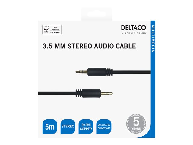 Produktbeskrivning DELTACO ljudkabel - 5 m Kabel Ljudkabel Längd 5 m Färg Svart Kontaktdon 3,5 mm ljuduttag - hane Kontakt (andra änden) 3,5 mm ljuduttag - hane Egenskaper 99,99 % koppar - Nedladdningsbara filer