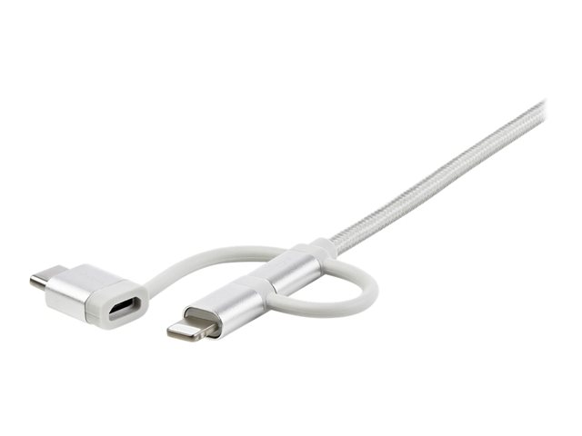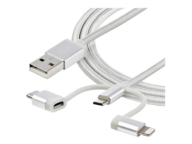 Produktbeskrivning StarTech.com 1 m USB-multiladdningskabel - USB till Micro-USB eller USB-C eller Lightning för iPhone/ iPad/iPod/Android - Apple MFi-certifierad - 3 i 1 USB-laddare - Vävd - USB-kabel - 1 m Typ USB-kabel Egenskaper Skärmad Kabellängd 1 m Kontakter 4-stifts USB typ A - hane Kontakter (andra änden) Apple Lightning - hane