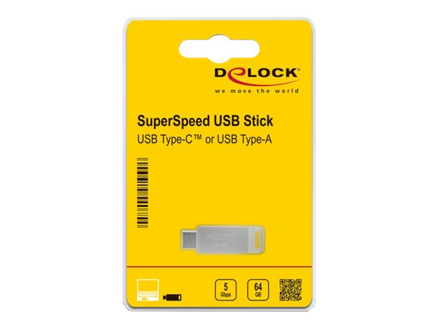 Produktbeskrivning Delock - USB flash-enhet - 64 GB Produkttyp USB flash-enhet Gränssnittstyp USB 3.2 Gen 1 / USB-C Minneskapacitet 64 GB Operativsystem erfordras Microsoft Windows 7 / 8.1 / 10 (32/64 bits), Linux Kernel 3.3 eller senare, Apple macOS Mojave 10.14.3 eller högre, Google Chrome OS 72 eller senare - Nedladdningsbara filer