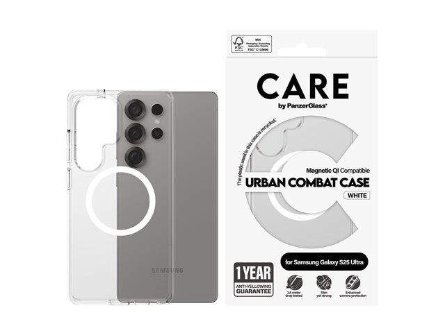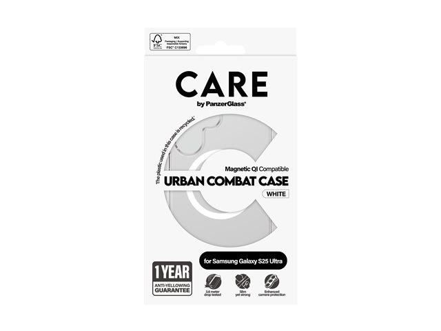 Produktbeskrivning CARE by PanzerGlass Urban Combat - baksidesskydd för mobiltelefon Typ av produkt Baksidesskydd för mobiltelefon Material Polykarbonat, termoplastisk polyuretan (TPU) Färg Transparent, vit Återvunnet produktinnehåll 100 % - tillverkad av återvunnen plast Designat för Samsung Galaxy S25 Ultra - Tillbehör