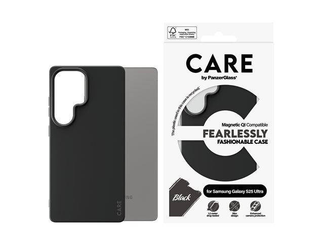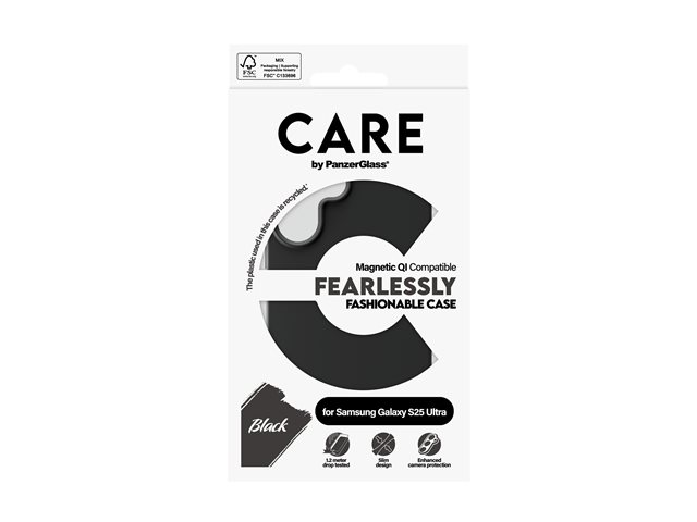 Produktbeskrivning CARE by PanzerGlass - baksidesskydd för mobiltelefon Typ av produkt Baksidesskydd för mobiltelefon Dimensioner (BxDxH) 8.2 cm x 1.3 cm x 16.6 cm Vikt 37 g Material Polykarbonat, mikrofiber, silikon Färg Svart Återvunnet produktinnehåll 100 % - gjord av återvunnen polykarbonat/mikrofiber/silikon Designat för Samsung Galaxy S25 Ultra - Tillbehör