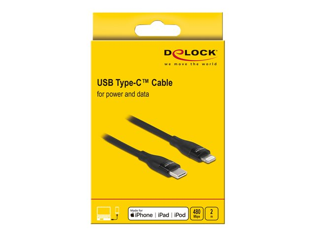 Produktbeskrivning Delock Lightning-kabel - 2 m Kabel Lightning-kabel American Wire Gauge (AWG) 30 (data)/22 (ström) Längd 2 m Färg Svart Kontaktdon 24 pin USB-C - hane Kontakt (andra änden) Lightning - hane Standarder som följs USB / USB 2.0 Märkström 3 A Egenskaper Strömförsörjningsstöd - Nedladdningsbara filer