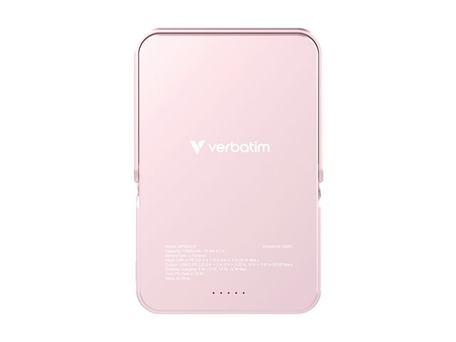 Produktbeskrivning Verbatim Charge 'n' Go trådlös powerbank - magnetisk, med stativ - Li-pol - 24 pin USB-C - 20 Watt Typ av produkt Trådlös powerbank Utformad för Mobiltelefon, surfplatta Dimensioner (BxDxH) 7.1 cm x 10.7 cm x 1.55 cm Vikt 217.8 g Färg Rosa Typ av utkontakt 24 pin USB-C Tillförd spänning 12 V Max elektrisk ström 3 A Snabbladdningsteknik Power Delivery Trådlös laddning Ja Batteri Litiumpolymer - 10000 mAh Effekt 20 Watt Strömenhetsinformation - 24-stifts USB-C - inmatning - 9 V - 18 W - 2 A