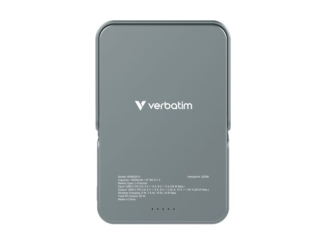 Produktbeskrivning Verbatim Charge 'n' Go trådlös powerbank - magnetisk, med stativ - Li-pol - 24 pin USB-C - 20 Watt Typ av produkt Trådlös powerbank Utformad för Mobiltelefon, surfplatta Dimensioner (BxDxH) 7.1 cm x 10.7 cm x 1.55 cm Vikt 217.8 g Färg Grå Typ av utkontakt 24 pin USB-C Tillförd spänning 12 V Max elektrisk ström 3 A Snabbladdningsteknik Power Delivery Trådlös laddning Ja Batteri Litiumpolymer - 10000 mAh Effekt 20 Watt Strömenhetsinformation - 24-stifts USB-C - inmatning - 9 V - 18 W - 2 A