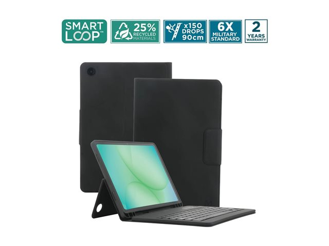 Produktbeskrivning Mobilis Element - tangentbord och foliefodral (foliofodral) - with french bluetooth keyboard - AZERTY - svart Inmatningsenhet Typ av enhet Tangentbord och foliefodral Gränssnitt Bluetooth Inmatningsenhet Inbyggt tangentbord Anslutningsteknik Trådlös Lokalisering och layout AZERTY Färg Svart tangentbord, svart fodral Vikt 322 g Designat för Samsung Galaxy Tab A11+, Tab A9+ - Nedladdningsbara filer