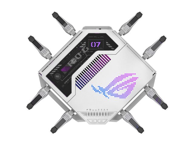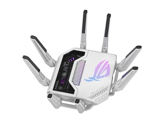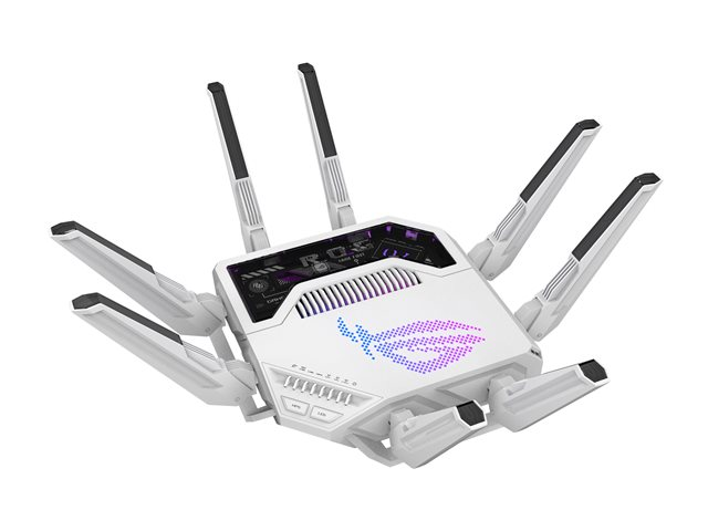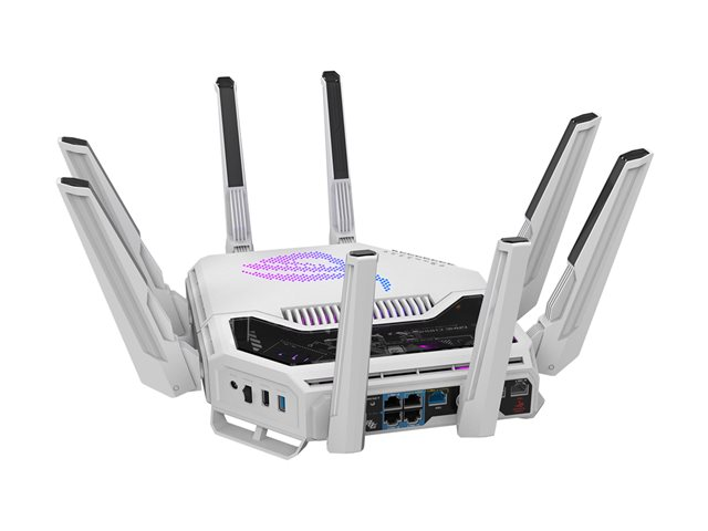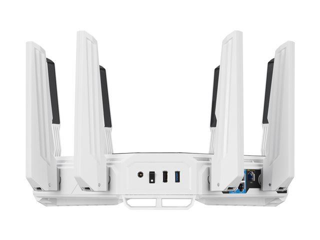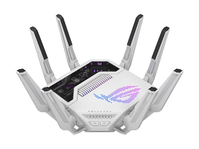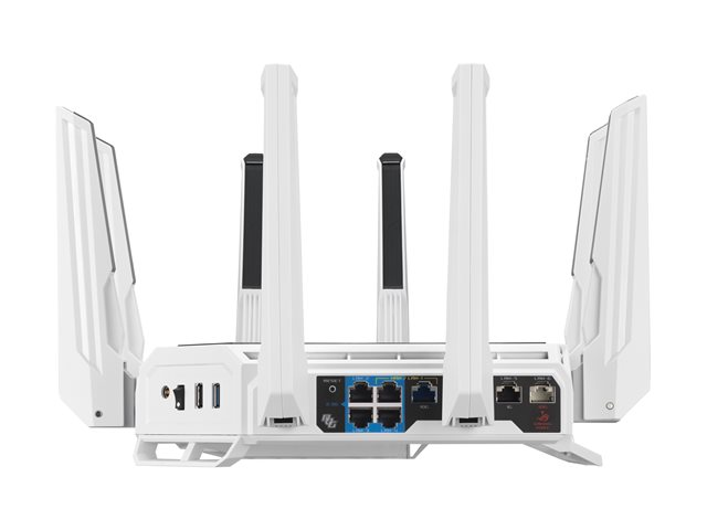 Produktbeskrivning ASUS ROG Rapture GT-BE19000AI - trådlös router - Wi-Fi 7 - skrivbordsmodell Typ av enhet Trådlös router - 6-portars switch (inbyggd) Gaming Ja Modell Skrivbordsmodell Antal WAN-portar 2 Datalänkprotokoll IEEE 802.11b, IEEE 802.11a, IEEE 802.11g, IEEE 802.11n, IEEE 802.11ac, IEEE 802.11ax (Wi-Fi 6), IEEE 802.11be (Wi-Fi 7), Ethernet, Fast Ethernet, Gigabit Ethernet, 2.5 Gigabit Ethernet, 5 Gigabit Ethernet, 10 Gigabit Ethernet Frekvensband 2,4 GHz/5 GHz/6 GHz Dataöverföringshastighet 11529 Mbps Prestanda 6 GHz överföringshastighet (4x4): 11529 Mbps