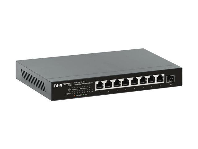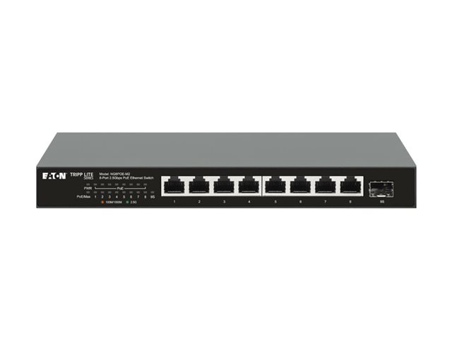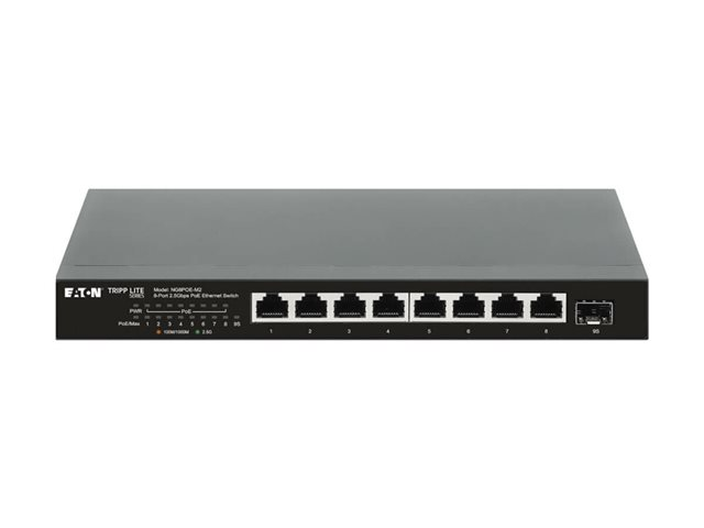 Produktbeskrivning Eaton Tripp Lite series Desktop Gigabit Ethernet Unmanaged Switch, PoE+ Pass-Through 8-Port 2.5 Gbps 100W Metal - switch - 8 portar - ohanterad - TAA-kompatibel Typ av enhet Switch - 8 portar - ohanterad Undertyp 2.5 Gigabit Ethernet Portar 8 x 10/100/1000/2.5G (PoE+) + 1 x 10 Gigabit SFP+ (upplänk) PoE (Power Over Ethernet) PoE+ PoE-budget 100 W Prestanda Växlingskapacitet: 60 Gbps