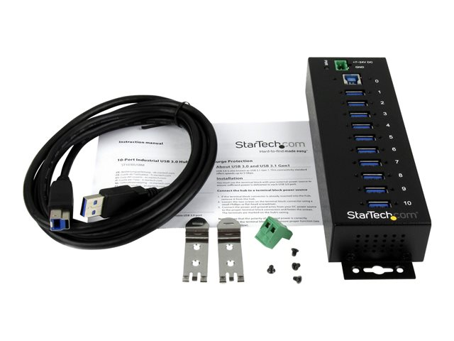 Produktbeskrivning StarTech.com USB 3.0-hubb med 10 portar - Industriell USB-A-hubb i metall med ESD- och överspänningsskydd - Monterbar på DIN-skena, vägg eller skrivbord - TAA-kompatibel USB-expansionshubb - hubb - 10 portar Typ av enhet Hubb - 10 portar Undertyp USB Portar 10 x SuperSpeed USB 3.0 Funktioner Överspänningsskydd, 15KV ESD Protector Standarder som följs USB 1.1, USB 2.0, USB 3.0 Strömtillförsel Likström 7 - 24 V Dimensioner (BxDxH) 19.8 cm x 5.6 cm x 3.1 cm Vikt 350 g Färg Svart Tillverkarens garanti 2 års garanti Designat för P/N: ITB20D3250, USB312SAT3CB, USB315CB2M, USBLT1MW, USBLT1MWS, USBLT2MBR, USBLT2MW, USBLT30CMW, USBLTM1MBK, USBLTM1MWH, UUSBHAUB1RA, UUSBHAUB3, UUSBHAUB3LA, UUSBHAUB3RA, UUSBHAUB6IN, UUSBHAUB6RA - Tillbehör