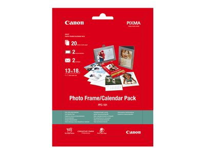 Produktbeskrivning Canon Photo Frame/Calendar Pack PFC-101 - set med fotopapper - 20 ark - 130 x 180 mm - 275 g/m² Typ av produkt Set med fotopapper Mediastorlek 130 x 180 mm Utskriftsteknik Bläckstråle Medievikt 275 g/m² Medföljande antal 20 ark - Nedladdningsbara filer