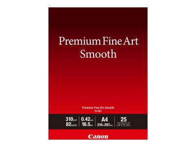 Produktbeskrivning Canon Premium Fine Art Smooth FA-SM1 - fotopapper - slät - 25 ark - A4 - 310 g/m² Typ av produkt Fotopapper Ytbeläggning Slät Mediastorlek A4 (210 x 297 mm) Utskriftsteknik Bläckstråle Medievikt 310 g/m² Tjocklek på medier 16,5 mil Ljusstyrka på medier 85 Medföljande antal 25 ark - Nedladdningsbara filer