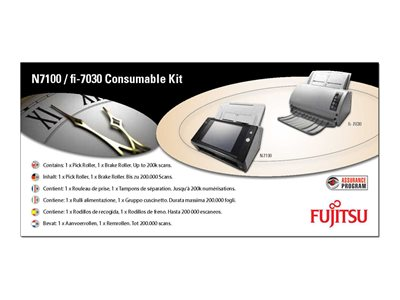 Produktbeskrivning Fujitsu Consumable Kit - valssats för skanner Produkttyp Valssats för skanner Förpackningens innehåll 1 plockrullare, 1 bromsvals Driftscykel 200 000 sidor Designat för Network Scanner N7100 - Nedladdningsbara filer