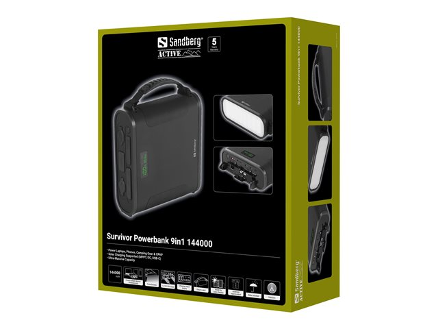 Produktbeskrivning Sandberg Survivor 9in1 power bank - + växelströmsadapter - LiFePO4 - 2 x USB-C, 2 x USB, 2 x bil cigarettändare, Anderson Typ av produkt Power bank + växelströmsadapter Dimensioner (BxDxH) 22 cm x 38 cm x 8.1 cm Vikt 4.5 kg Typ av utkontakt Total 7: 2 x USB-C, 2 x USB, 2 x bil cigarettändare, Anderson - på kabel: USB-C Nätspänning 12 - 24 / 5 / 9 / 12 / 15 / 20 V Tillförd spänning 5/9/12/15/20 V Max elektrisk ström 30 A Batteri Litium järn fosfat - 144000 mAh - 460.8 Wh Strömenhetsinformation - 24 pin USB-C with Power Delivery - 100 W
