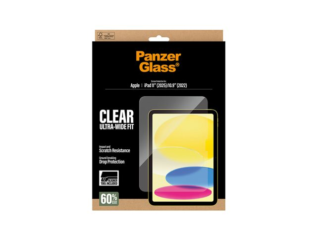 Produktbeskrivning PanzerGlass - skärmskydd för surfplatta - ultra-bred passform, med FASTFIT-verktyg Typ av produkt Skärmskydd - glas Avsedd för Surfplatta Skydd Reptålig, stöttålig, droppskydd, stötsäkert, klåfingerskydd, motstår fingeravtryck, oljeavvisande, vattenavstötande, smutsresistent, stötskydd Beläggning Oleofob Förpacknings innehåll Skärmskydd, justeringsverktyg Produktmaterial PET (Polyethylene Terephthalate), härdat glas (super+) Dimensioner (BxDxH) 17.351 cm Längd 24.264 cm Grovlek 0.45 mm Vikt 52 g Färg Klar Designat för Apple 10.9-inch iPad (10:e generation); iPad (A16) - Nedladdningsbara filer