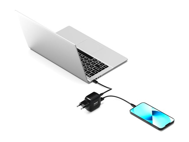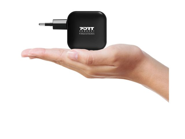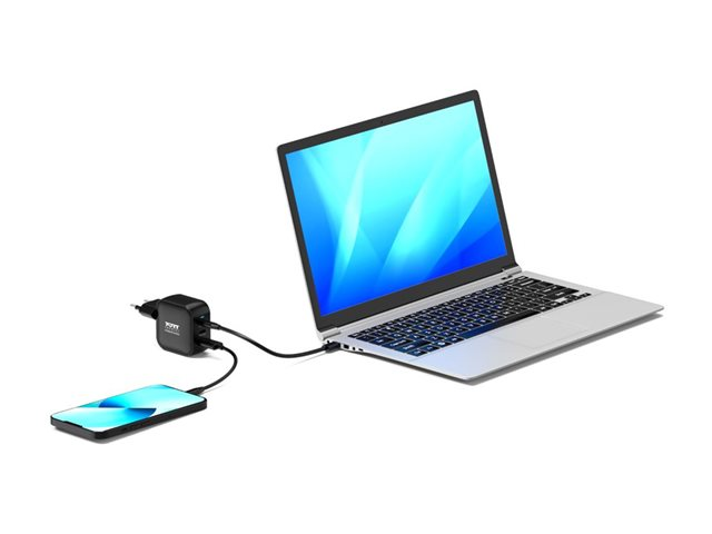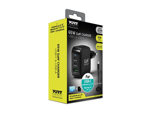 Produktbeskrivning PORT Connect strömadapter - GaN II, with 2 m cable - 2 x USB-C, USB typ A - 65 Watt Typ av produkt Strömadapter Utformad för Surfplatta, mobiltelefon, anteckningsbok Dimensioner (BxDxH) 9.1 cm x 3.6 cm x 5.4 cm Vikt 125 g Lokalisering Europa Typ av utkontakt Total 3: 2 x USB-C, USB typ A - på kabel: USB-C Nätspänning AC 100-240 V (50/60 Hz) Tillförd spänning 3.3 - 11 / 5 / 9 / 12 / 15 / 20 V Max elektrisk ström 5 A Snabbladdningsteknik Power Delivery 3.0, Qualcomm Quick Charge 3.0 Effekt 65 Watt Strömenhetens driftlägen USB-C1 + USB-C2 - 45 W + 20 W